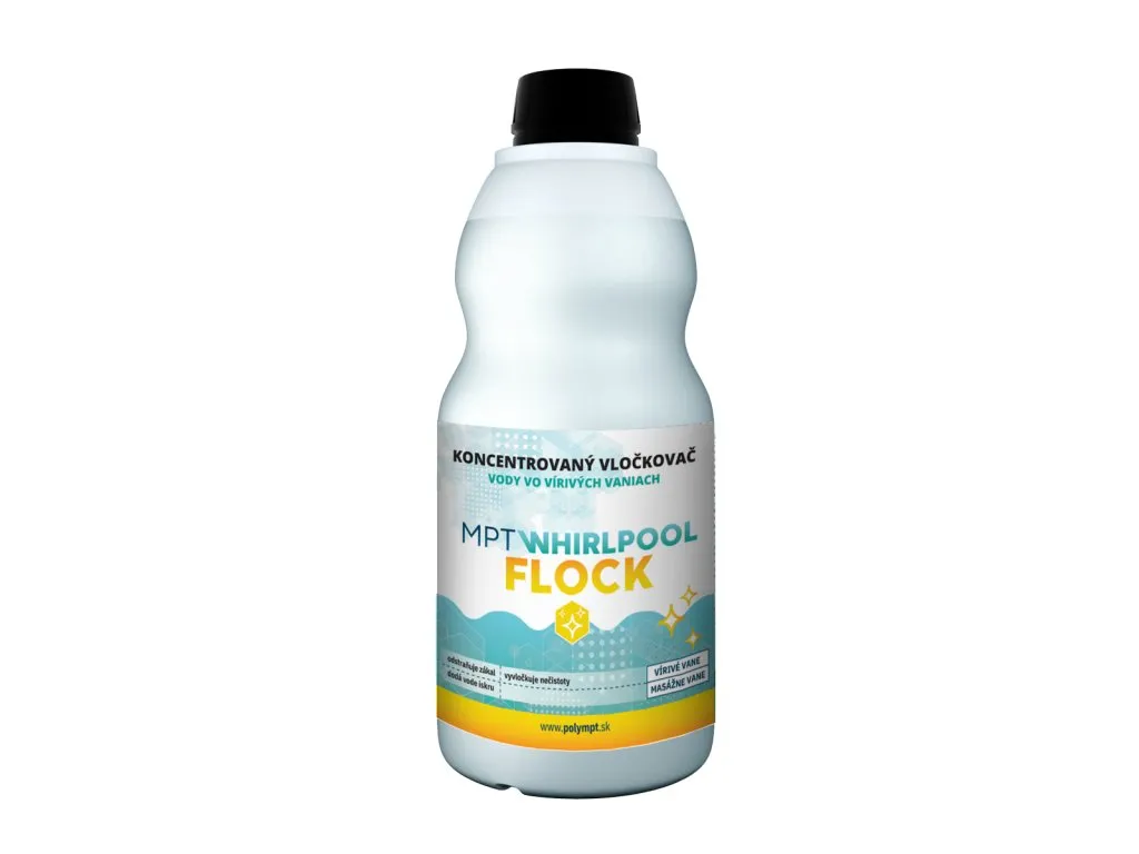 Polymérový vločkovač a rozjasňovač MPT WHIRLPOOL FLOCK je tekutý, koncentrovaný produkt určený na vločkovanie drobných nečistôt a odstránenie zákalu vody vo vírivke. Združí (vločkuje) aj veľmi jemné rozptýlené nečistoty do väčších celkov, ktoré sa zachytia na filtračnom zariadení. Zároveň dodá vode požadovanú „priehľadnosť a iskru". Vlastnosti: Vysoko účinný polymérový vločkovač je ideálny v kombinácii s bezchlórovou dezinfekciou Poly Whirlpool, ľahká manipulácia, mierne znižuje pH vody. Voda ošetrená prípravkom MPT WHIRLPOOL FLOCK nepáchne chlórom, nedráždi oči, kožu ani sliznice. Je vhodná pre alergikov, astmatikov a ekzematikov. MPT WHIRLPOOL FLOCK nepoškodzuje technológiu vírivky. Dávkovanie: Bežné dávkovanie (mierne vločkovanie) 50 ml/1 m3 vody, a to 1x za 7-10 dní. Pre intenzívne vločkovanie veľmi znečistenej vody 100 ml/1 m3 vody. UPOZORNENIE: Pri predávkovaní môže prísť k zakaleniu vody. V takomto prípade je potrebné vodu nariediť. Pred dávkovaním odporúčame skontrolovať a upraviť pH vody na hodnotu 6,8 – 7,2.