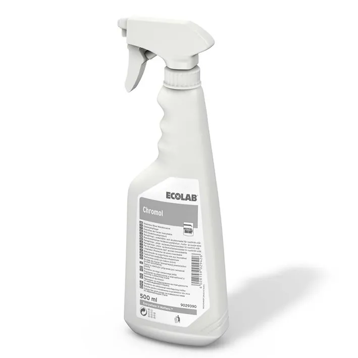 ECOLAB Chromol s MR - prostriedok na ošetrenie a ochranu nerezových plôch (500ml): Prostriedok je vhodný na vonkajšie povrchy kuchynských strojov, obkladov kuchynského zariadenia, zariadení na pečenie a vyprážanie, pracovných plôch, skríň, regálov a výčapných pultov.