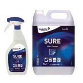SURE Glass Cleaner je k dispozícii v recyklovateľných 750 ml fľašiach a 5 l bandaskách. Bandasky je možné použiť pre opakované plnenie 750 ml fliaš, ktoré sú jednoduchšie pre každodennú manipuláciu.