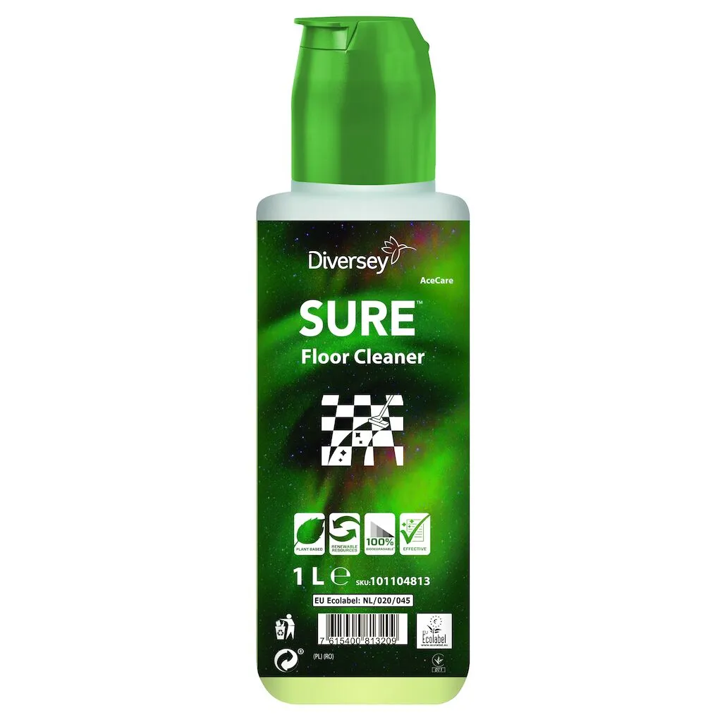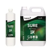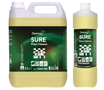 SURE Floor Cleaner je koncentrovaný málo penivý čistiaci prostriedok na denné čistenie všetkých vode odolných tvrdých podláh. Prostriedok je vhodný na všetky typy podláh s vode odolným povrchom. Doporučuje sa pre všetky metódy čistenia, vrátane čistenia pomocou vedra alebo pomocou podlahového automatu.