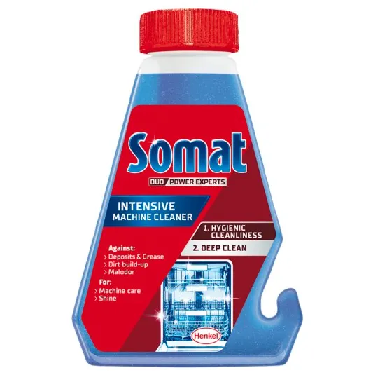 Vo filtri, na striekacích ramenách, v tryskách a v rúrkach sa postupom času usadzuje vodný kameň a mastnota. Somat čistič umývačky s koncentrovaným zložením odstraňuje usadeniny aj z týchto ťažko dostupných miest, a dokonca ho možno použiť aj na čistenie gumových tesnení.