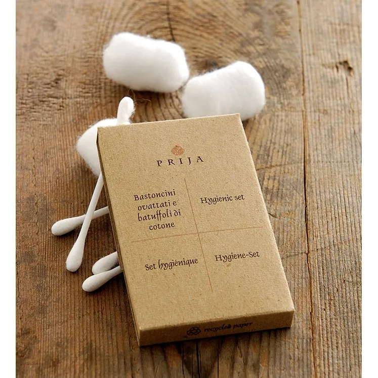 Hygienická súprava v 100% krabici z recyklovaného papiera s utesneným predrezaním. Obsahuje: 4 x vatové tyčinky 3 x bavlnené tampóny Rozmery krabice: 8,5 x 5,3 x 1 cm