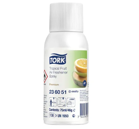 Vôňu vo vašej toalete a umyvárni môžete dôkladne a efektívne regulovať vďaka Tork ovocnej vôni do osviežovača vzduchu. Spreje obsahujú vonné oleje a patentovanú zložku neutralizujúcu zápachy na elimináciu nepríjemných zápachov a zároveň poskytujú dlhotrvajúci pocit čerstvého vzduchu. Spreje sú vhodné do Tork elektronického zásobníka na osviežovač vzduchu.