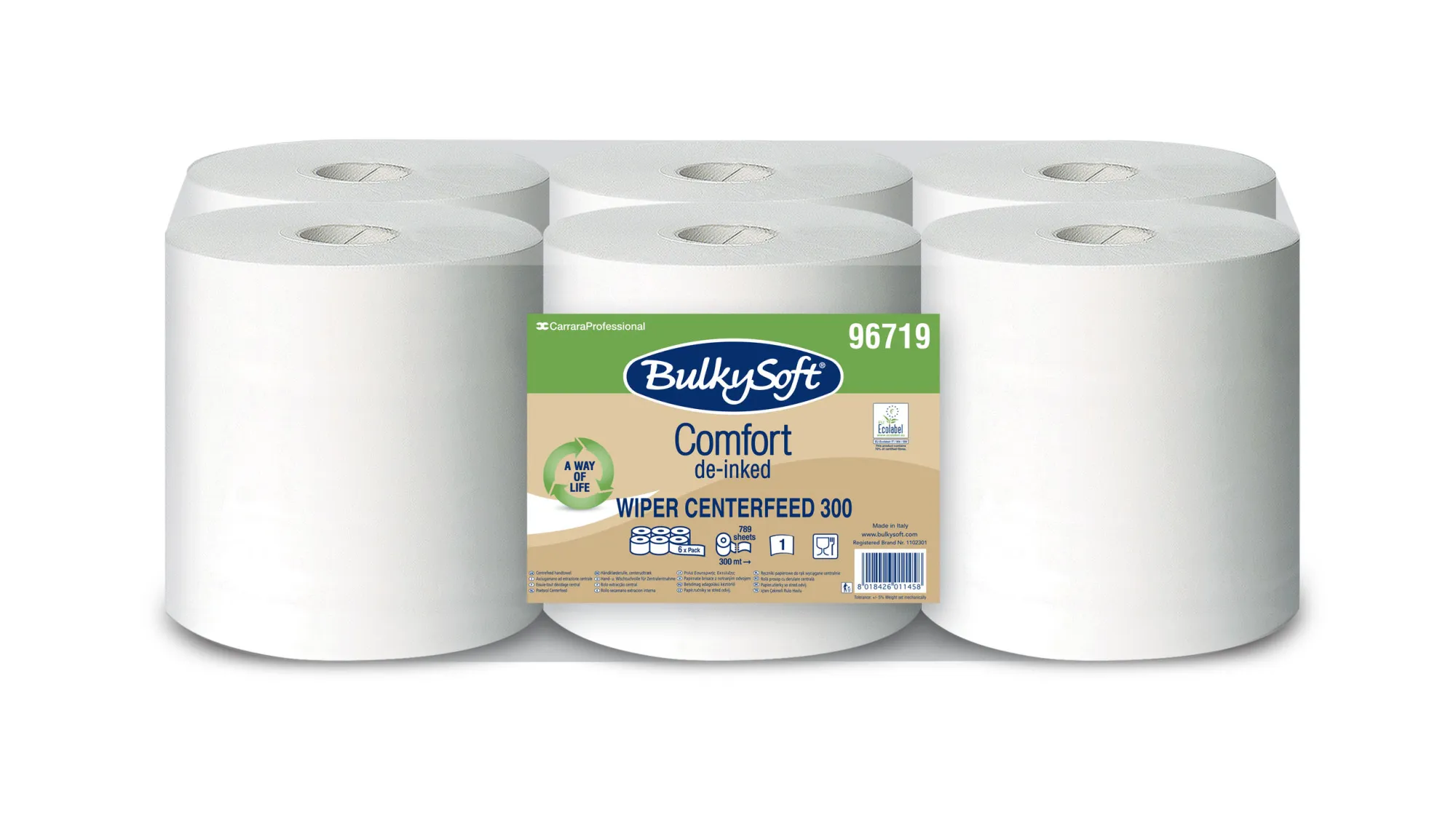 Papierové utierky so stredovým odvinom BulkySoft Comfort, 1-vrst., 300 m, biele (6 ks/krt)