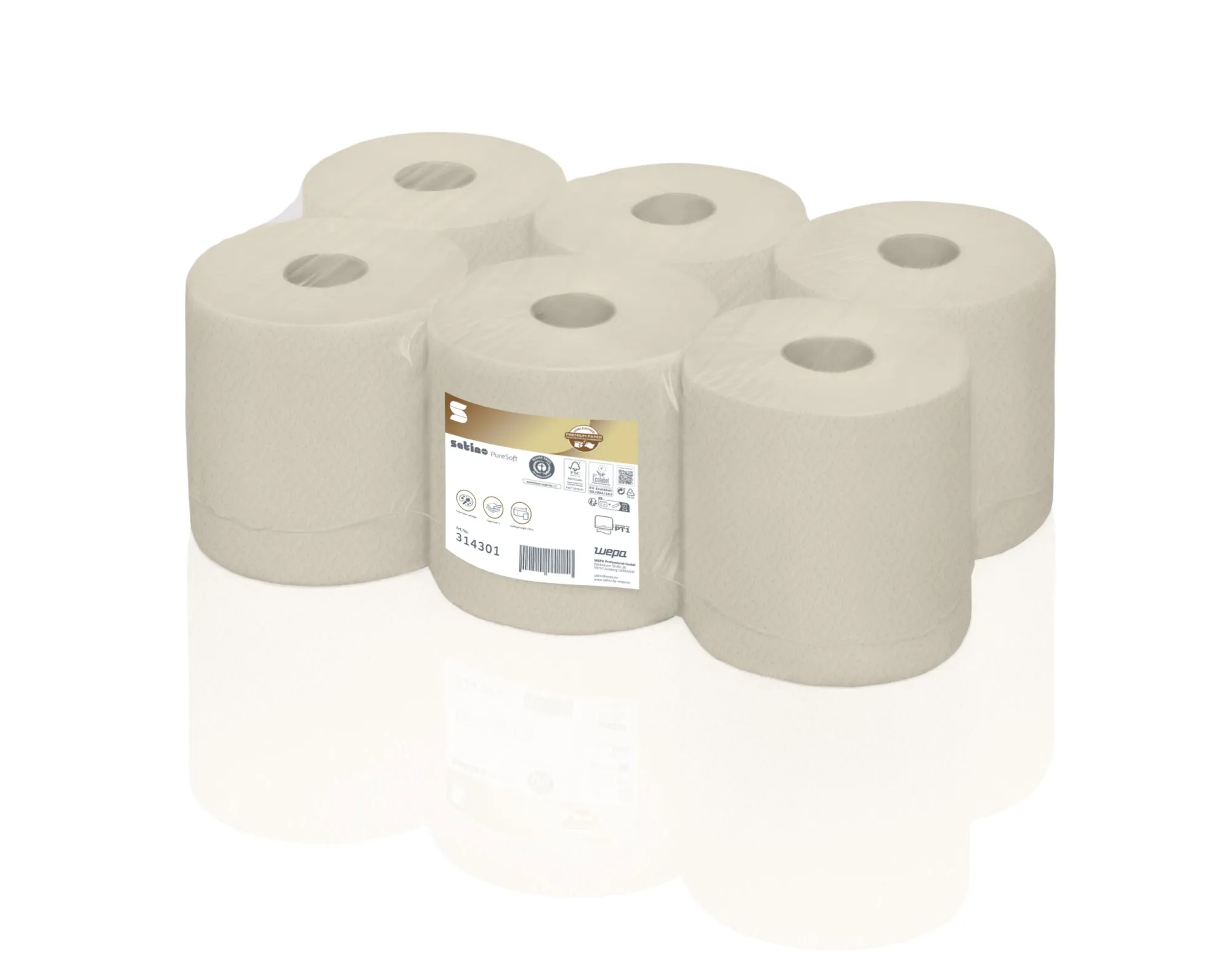 PureSoft sa vyznačuje bezkonkurenčnou mäkkou a absorpčnou kvalitou. Je nebielený, luxusne mäkký, najmä absorpčný a hygienicky bezpečný vo všetkých aplikáciách – od papierových utierok, cez toaletný papier, až po kuchynské utierky. Satino PureSoft je výsledkom intenzívneho výskumu a pokročilosti technológie papiera vo WEPA – a míľnik vo vývoji ekologických prémiových vlákien. Vďaka svojmu inovatívnemu výrobnému procesu PureSoft je jedným z najjemnejších prírodne farebných papierov na trhu. Utierka na ruky Autocut Matic SATINO PureSoft: ![EU Ecolabel]()