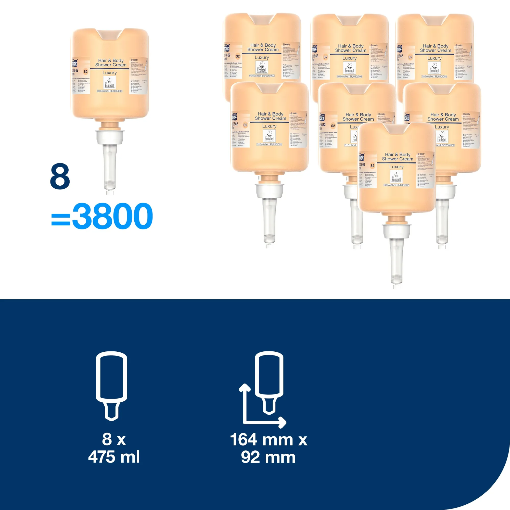 Tork luxusný sprchový gél na vlasy a telo poskytuje luxusný zážitok 3 v 1 ideálny pre hotely, kúpele a športové zariadenia. Vďaka obsahu arganového oleja a kondicionéru poskytuje trojitú výhodu osviežujúceho šampónu, kondicionéru a hydratačného sprchového gélu. Šetrne očistí vlasy aj telo a výživný šampón poskytne vlasom výživu, aby zostali jemné a pružné. Vhodné pre Tork zásobníky na mydlá a dezinfekčné prostriedky, ktoré sú overené ako ľahko používateľné a všetkým používateľom zabezpečujú správnu hygienu rúk.