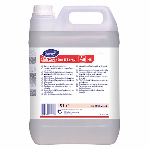 Popis: Soft Care Des E Spray je bezoplachový dezinfekčný prostriedok na ruky na báze alkoholu (71,58%). Má uplatnenie v zdravotníctve a pri ošetrení pracovníkov, ktorí prichádzajú do priameho styku s potravinami. Kľúčové vlastnosti: Dezinfekčný prostriedok na ruky na báze etanolu (68%). Etanol je účinná dezinfekčná látka, ktorá pôsobí na trvalú aj prechodnú mikroflóru pokožky, je účinný voči baktériám (MRSA) a kvasinkám. Je tiež účinný voči obaleným vírusom, ako je chrípka a tiež niektorým neobaleným vírusom, ako je Norovirus a Adenovirus.