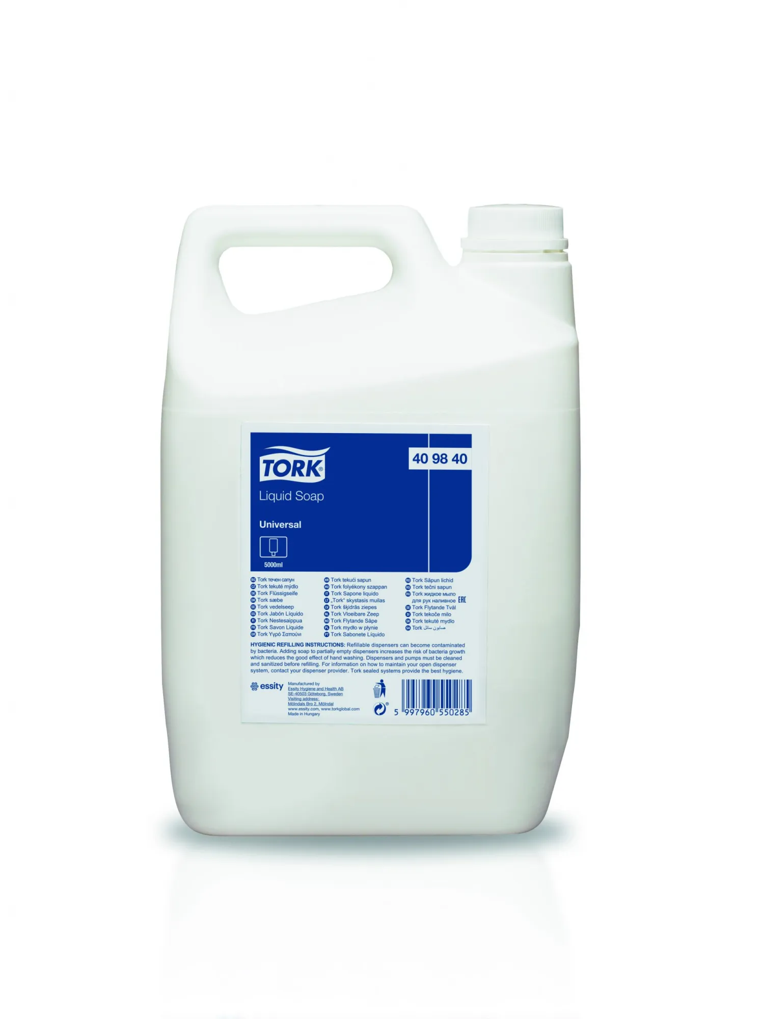 Tekuté mydlo Tork je mydlo na všetky druhy používania, ktoré je vhodné na každodenné umývanie rúk. Pokyny pre hygienické napĺňanie Zásobníky s možnosťou napĺňania môžu byť kontaminované baktériami. Pridaním mydla do čiastočne plných zásobníkov sa zvyšuje riziko rastu baktérií, čo znižuje pozitívny účinok umývania rúk. Zásobníky a pumpy musia byť pred napĺňaním čisté a vydezinfikované. Objem 5l