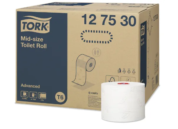 Tork Mid-size Twin zásobník na toaletný papier je moderný a efektívny systém vhodný pre nízko až stredne frekventované toalety a umyvárne s vysokým dôrazom na spokojnosť zákazníkov. Zabezpečuje sa tak vysoká účinnosť a to, že toaletný papier je pre hostí vždy k dispozícii. Tork Mid-size jemný toaletný papier v kvalite Advanced predstavuje rovnováhu medzi cenou a funkčnosťou.