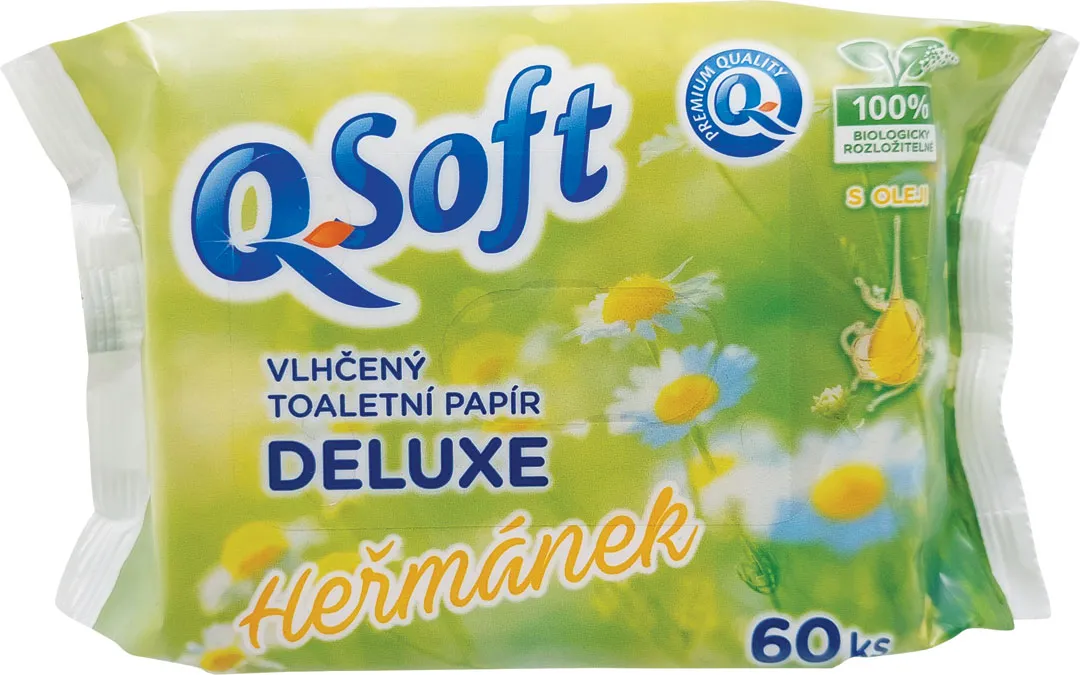 Q-soft vlhčený toaletný papier s obsahom harmančeka je určený k dennej hygiene.