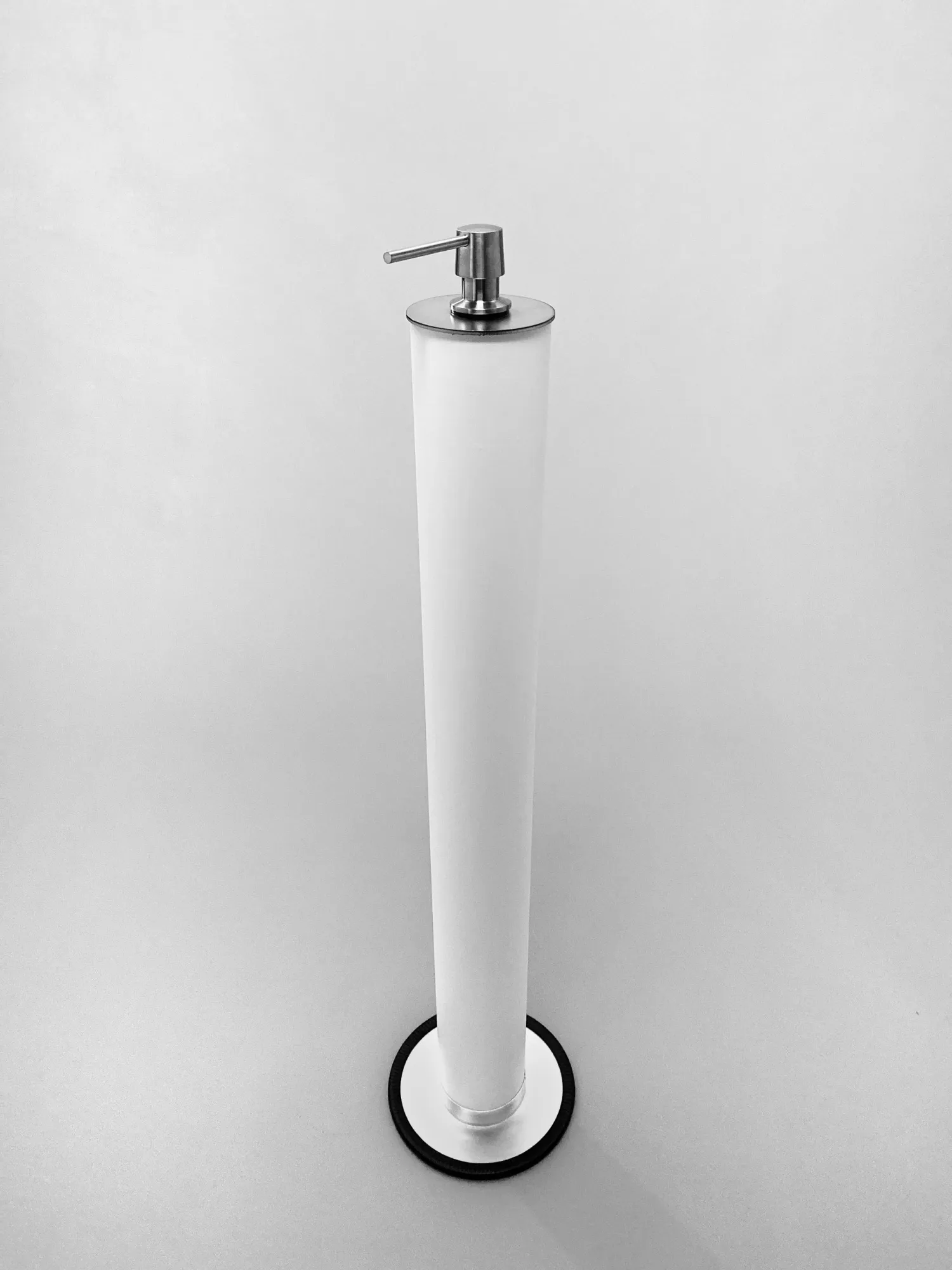 Univerzálny dávkovač na dezinfekciu, prostriedok na jar, mydlo a iné tekuté prostriedky s možnosťou zabudovania do pracovnej dosky, či iného kusu nábytku. Nádobka z plastu. Pumpa z chrómu.