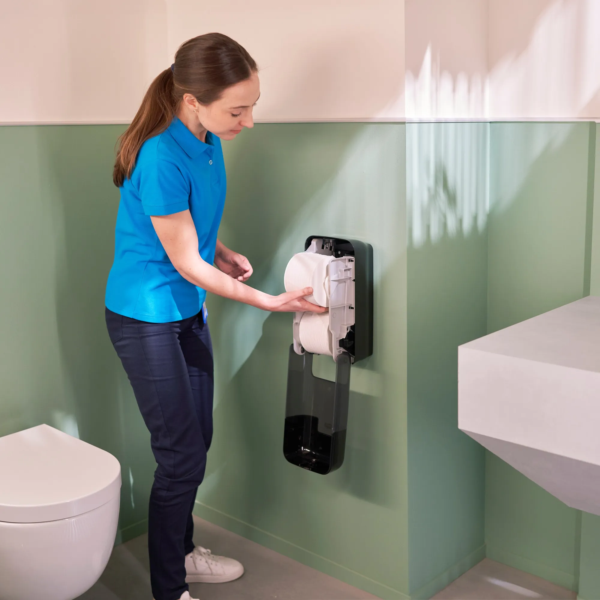 - Vysoká kapacita, znížená potreba úložného priestoru a certifikovaný dizajn s jednoduchou obsluhou z neho robia lepšiu alternatívu k bežnému toaletnému papieru a rolkám jumbo
