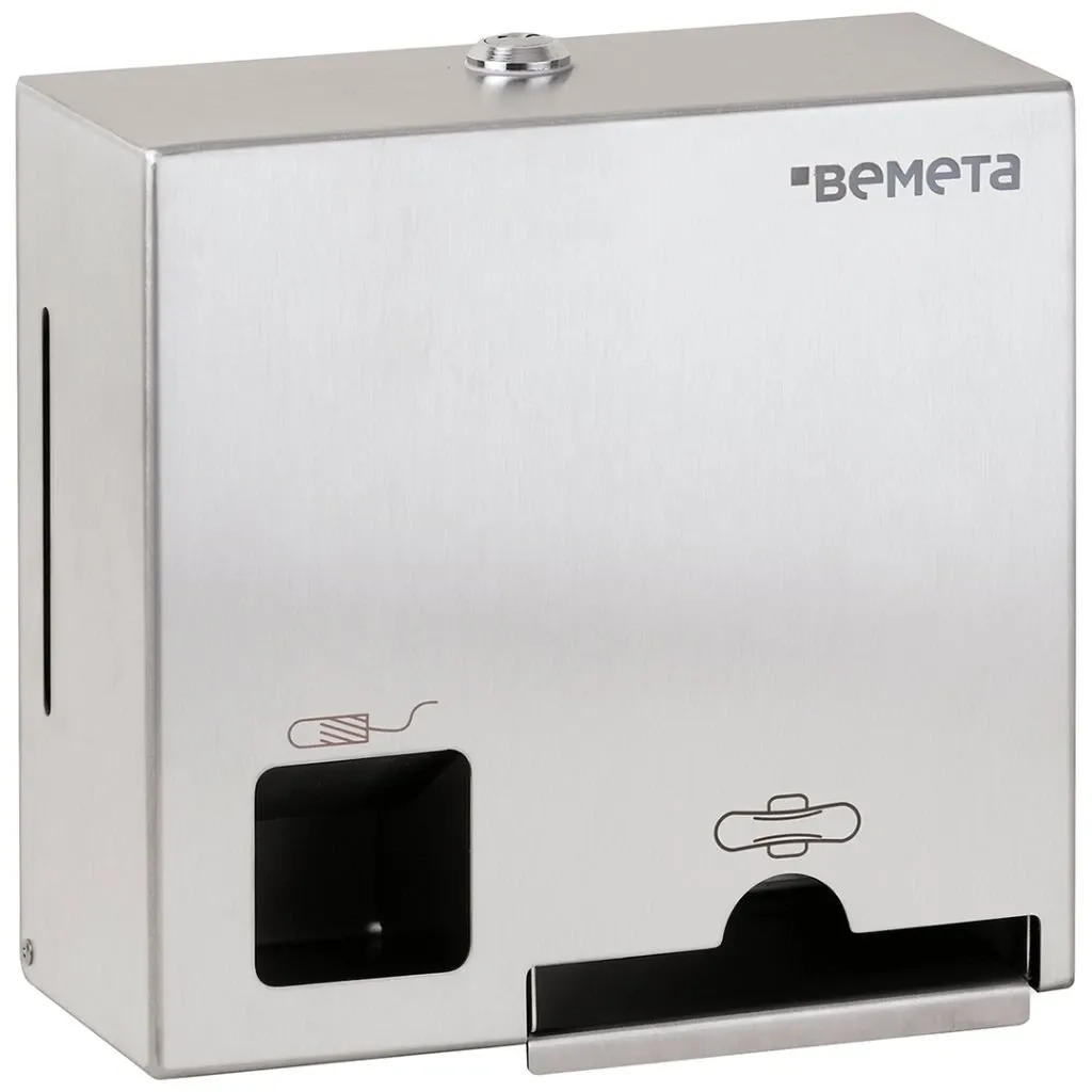 Nerezový zásobník na hygienické vložky a tampóny (25–30 vložiek, 100 tampónov), matný brúsený povrch, nástenný, s jednoduchým odomykaním.Zobraziť celý popis