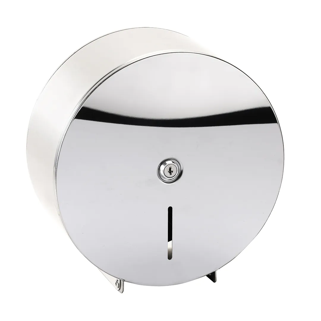 Bubnový zásobník na toaletný papier Ø 260 mm, lesk je elegantný a robustný držiak navrhnutý pre verejné aj domáce kúpeľne, ktorý pojme veľkú rolu toaletného papiera a udržiava ju hygienicky ukrytú a suchú — ideálny do hotelov, kancelárií či komerčných priestorov.